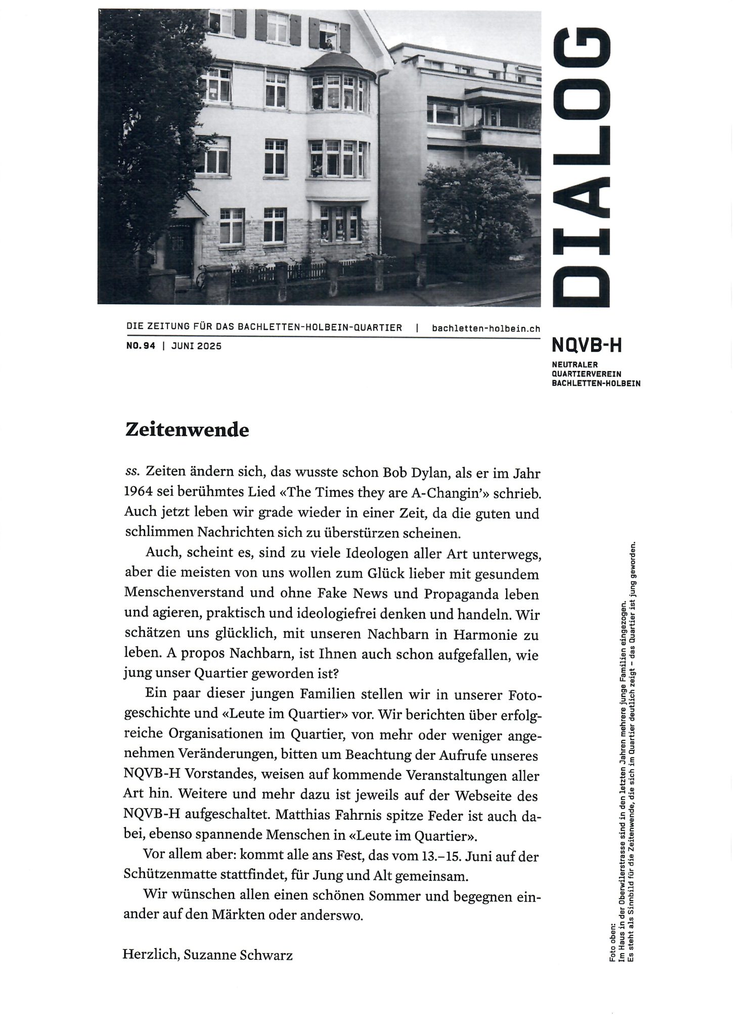 Die Zeitschrift für das Bachletten-Holbein Quartier erscheint halbjährlich im Juni und November.
